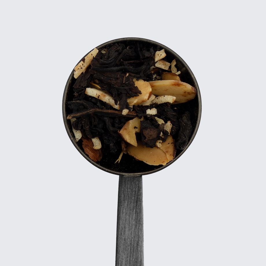 Black tea, almond halves, coconut shreds, maca, vanilla extract, eleuthero (Siberian ginseng).